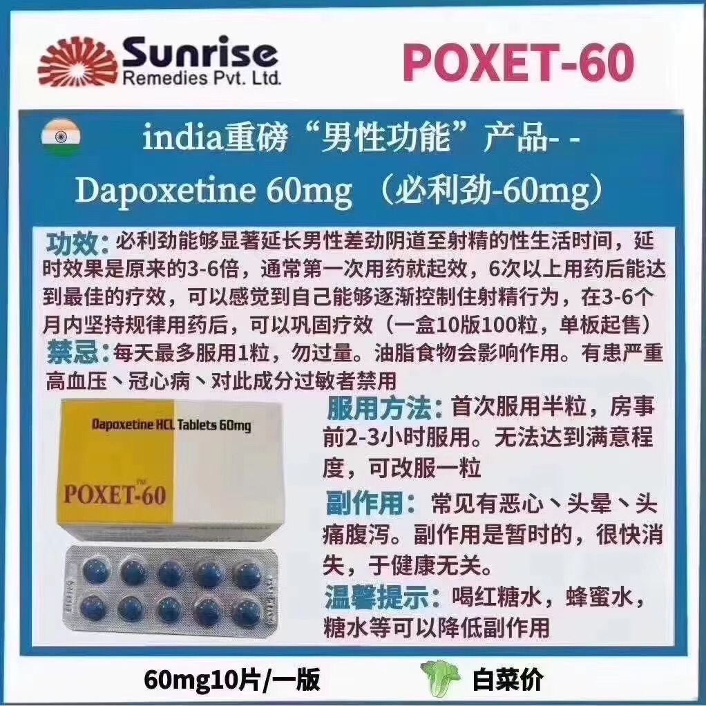 ◾单效必利劲(延时) 通常用于治疗用药,当然也有不少用户在有硬度基础情况下来作为速效应急使用,但是前提你需要有极高的硬度基础,硬度基础差会导致途中疲软,影响体验感。一般不建议不需要助勃且基础不错的用户选择它作为速效延时产品 ◾成分:达泊西汀60mg ◾效果:延时治疗 ◾特点:副作用低 性价比高 ◾规格:一盒10板100粒一板10粒