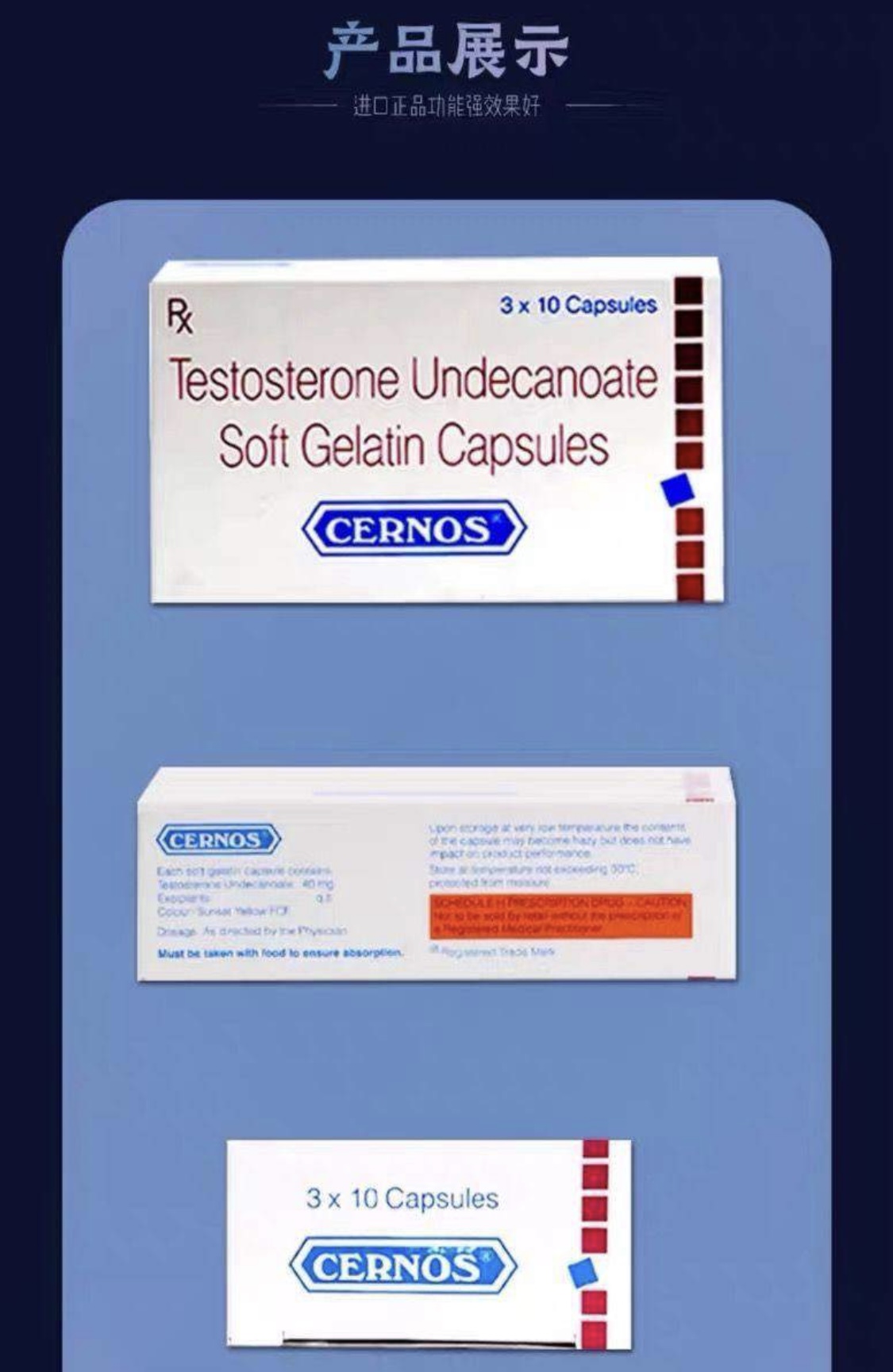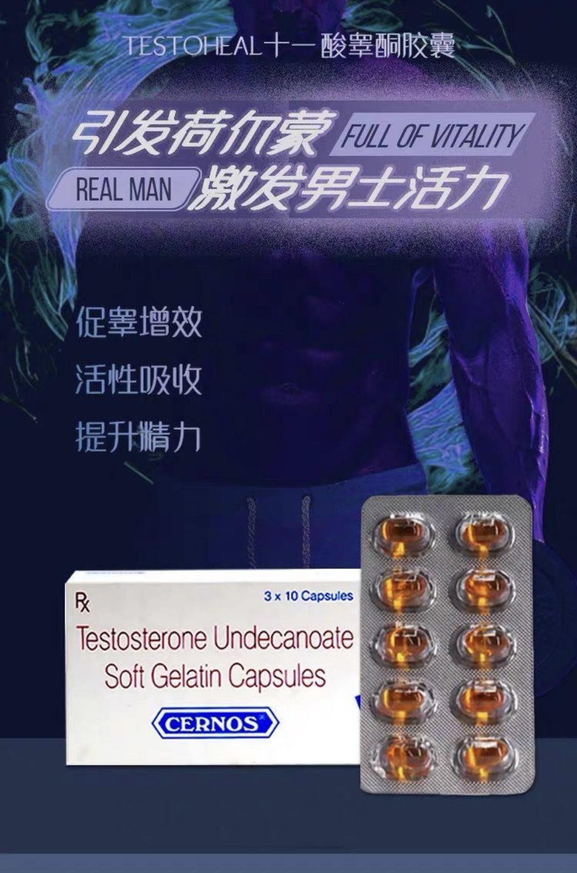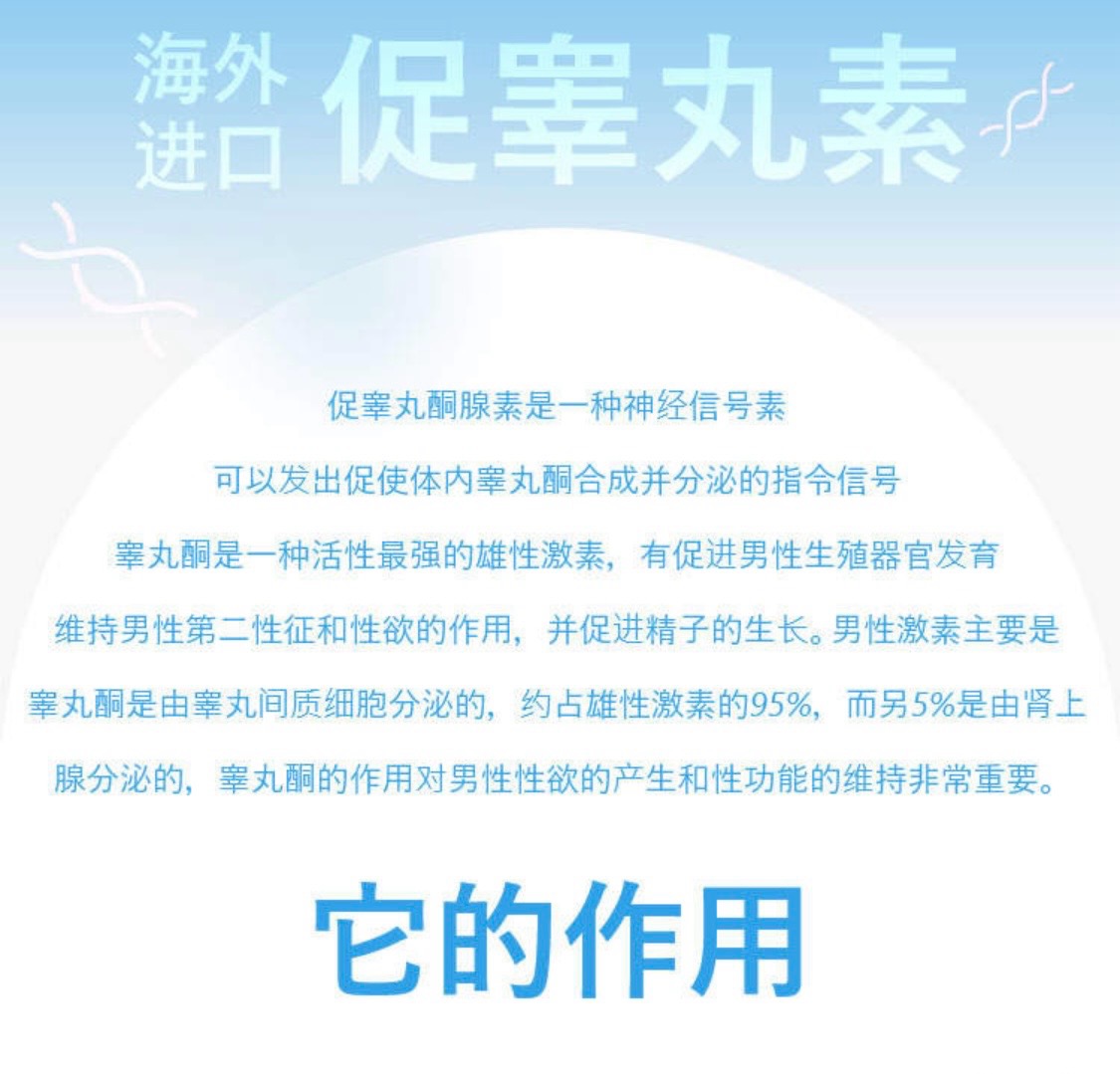 ◾印度十一酸睾酮软胶囊 Testosterone undecanoate ◾主要成份:活性成份为十一酸睾酮 ◾规格:40mg/粒30粒/盒 ◾主要作用:1.原发性或继发性睾丸功能减退;2.体质性青春期延迟;3.乳腺癌转移的姑息性治疗;4.再生障碍性贫血的辅助治疗;5.部分性雄激素缺乏综合征。6.男性的生殖内分泌功能逐渐减退,血浆睾酮水平逐渐降低,缺乏睾酮素可能会导致包括阳痿、性欲低下,阴茎缩水,病倦无力,记忆力减退、骨质流失等一系列健康问题 ◾用法用量:口服,随餐服用,每天三次,每次一粒,或遵医嘱。 ◾禁忌:确诊及可能前列腺癌、乳腺癌患者禁用。 ◾药理毒理:本品雄激素类药,为睾酮的十一酸酯,是睾酮的衍生物。可促进男性生长、男性第二性征和睾丸、副性腺结构的发育。促进蛋白质的合成和减少分解,增强免疫功能,促进骨骼生长。促进红细胞生成,反馈性抑制促性腺激素分泌,抑制雌激素分泌。 ◾药代动力学:本品口服后,经肠道吸收并通过淋巴系统进入血液循环。体内的分布以肝、肾、脂肪组织为主,提肛肌、附睾、前列腺其次,十一酸睾酮大部分在体内水解成睾酮,以原型从尿中排泄约占总量的7.2%。