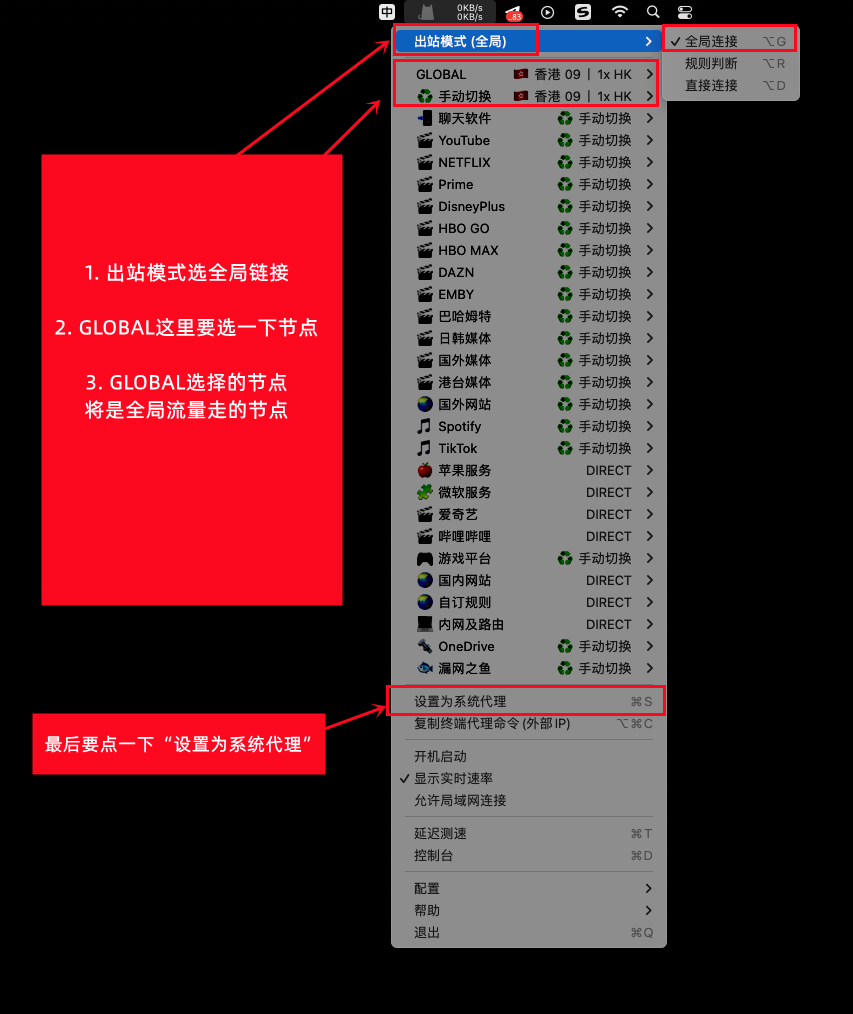 如果默认的分流模式您无法正常使用,可以按照下方图示开启“全局代理”